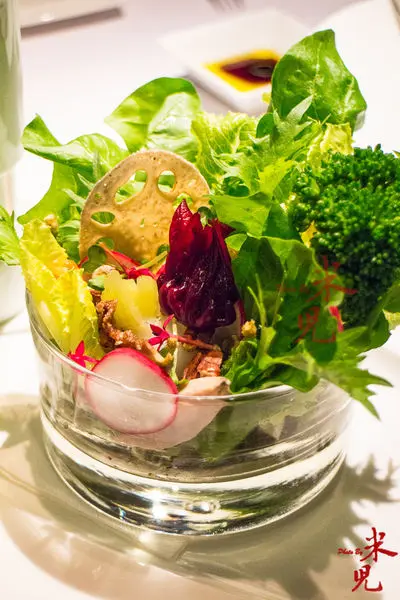 野菜沙拉,裡頭寶貝很多,是來自苗栗有機達人農場的綜合時蔬,包括綜合根莖蔬菜、萵苣生菜等鮮蔬與自製烘乾蔬果(奇異果乾、柳橙乾、無花果乾)最後再灑上堅果與橄欖碎,看起來真的很繽紛,裡頭很妙的是還有剛長成的BB小黃瓜,很有意思,醬汁則是熱熱地呈在旁邊,一邉吃一邊沾。