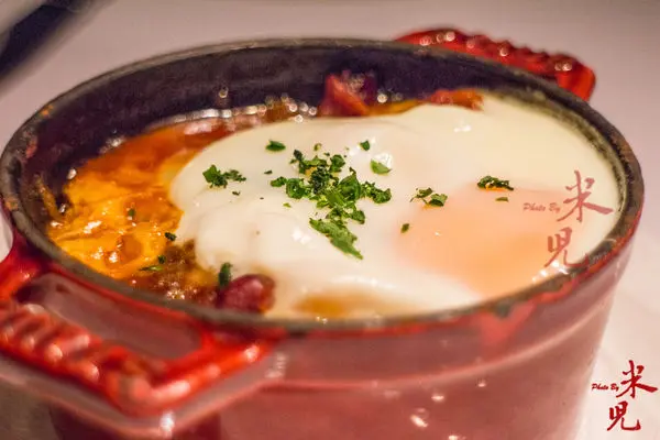 前菜部位的迷你肉丸烘蛋,結合墨西哥風味與法式做法,把牛肉、雞肉製成的肉丸與番茄、墨西哥辣椒、紅腰豆等所製成的辣椒醬,和法國進口新鮮黃菇、鋪上塔吉歐和貝里起司,一同入約190度烤箱烤約,最後加入一個特選帝王蛋,吃的時候拌在一起,你可以想像那個風味嗎?