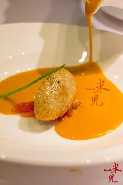 奶油番茄湯是把深海魚肉打成泥,加上山葵做成魚丸,炸過後放盤底,底下襯上用洋蔥、大蒜去燉的番茄,上桌時再倒入熱暖暖的番茄濃湯,酸甘誘人。