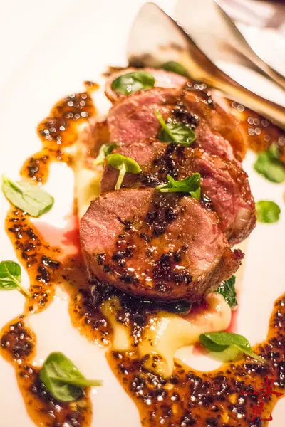爐烤純種盤克夏黑豬梅花與在地活菌豬肋眼排,1880大洋。是用來自美國愛荷華州是純正「六點白」純種盤克夏黑豬,這種豬肉被譽為豬肉界的神戶級肉品,有非常豐潤的油花,梅花肉部分更是油潤迷人,主廚很有巧思地將它與台灣在地活菌豬的肋眼一同上桌,可以一次品嘗到二種不同豬肉的口味,經過比較之後,你們猜米兒比較喜歡哪一種豬肉呢?值得一提的是盤邊另外搭配的蘋果,淡淡酸香,剛好中和吃太多豬肉的膩,相得益彰。