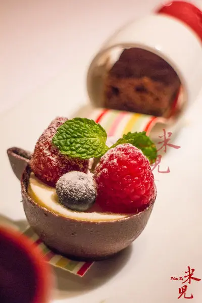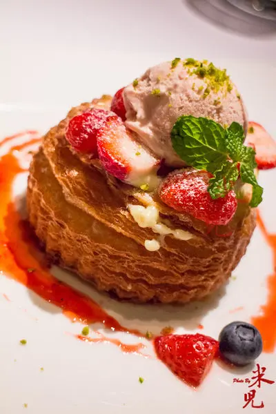 再怎麼飽都有胃吃甜點,我期待很久的千層甜甜圈終於上桌!哇~~看起來真是不像甜甜圈,果然是高級版,如果單點是360大洋呢!上頭還加了自製草莓冰淇淋和新鮮草莓,還有卡士達醬的香滑,我好想一個人嗑掉一整個!
