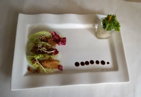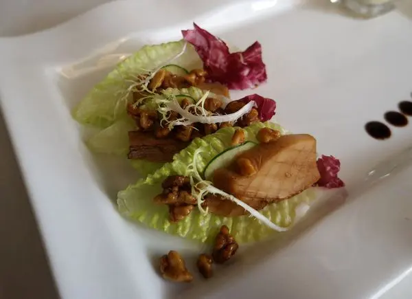 新鮮美生菜搭配杏鮑菇,非常脆口,杏鮑菇淡淡醬香味,最後灑上核桃粒,畫龍點睛,香氣到味,口感非常有層次