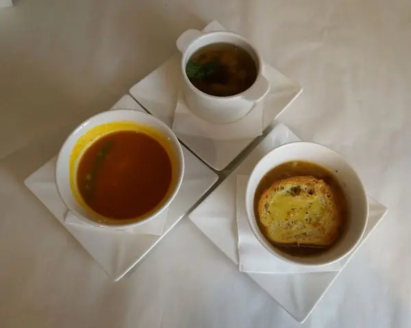清燉野菇湯(上) 米蘭南瓜濃湯(左下) 起士洋蔥湯(右下)