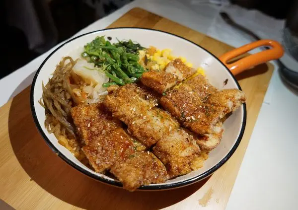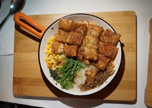 遠看好像雞排飯呀 醬燒杏鮑菇真的太誘人啦~搭配著五色蔬果是覺上很搶眼!