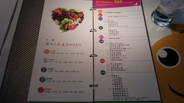用餐方式是先讓客人點選套餐或單點,套餐NT$398元/人(另加10%服務費)。前菜、麵包、醋飲為固定菜色,依次點選(沙拉、湯、主餐、甜點、飲料),每道餐均有不同菜色可選擇(部分菜色隨季節更替),點餐的同時,服務人員都會詢問,因為部分餐點食材也不完全都是「全素」含蛋、奶與五辛調味料,純素的朋友要注意喔!才能避開辣/蔥/蒜/蛋,點完餐後服務人員將依順序上菜。