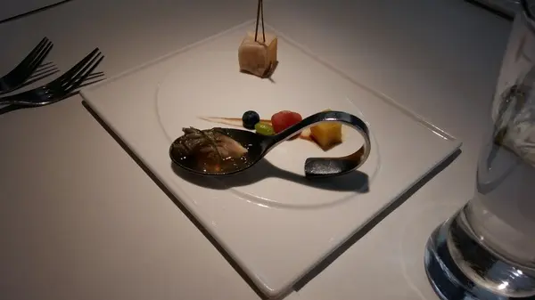 薄透的四方外層恰似起士圈,原來是薄透的煙燻杏鮑菇包覆著鮮甜的哈密瓜,一口吃下湯匙上以珍貴的生蠔葉,搭配調味梅子凍的舞菇,但其實生蠔葉的特殊生蠔味並不明顯突出,只覺得口感開胃爽口。