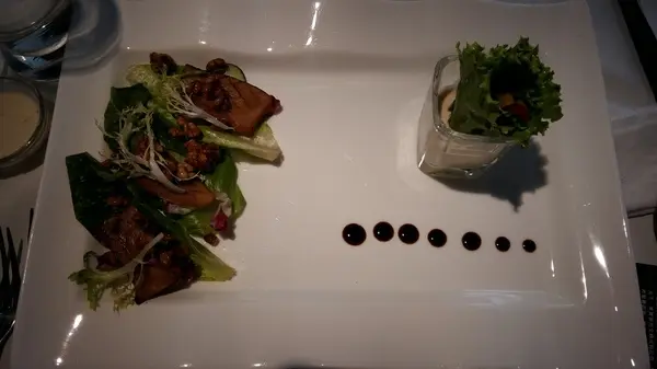 主廚雕花成烤花枝模樣的鮮甜杏鮑菇裹上水果醬油,搭配新鮮的美生蔬菜以及香脆的核桃粒,也可拌入主廚特製沙拉醬,口感清爽富有層次。
