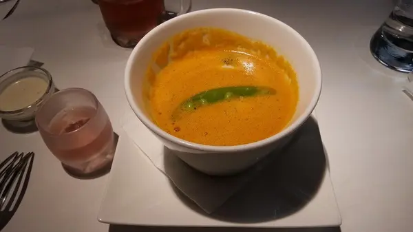 本以為以質地綿密的南瓜與地瓜打成泥煮製而成,會口感濃郁滑順,但實際品嚐時覺得南瓜、地瓜菜鮮味口感略為明顯,喝的到蔬果顆粒但偏稀釋口感,撈的到帶皮南瓜丁果肉。
