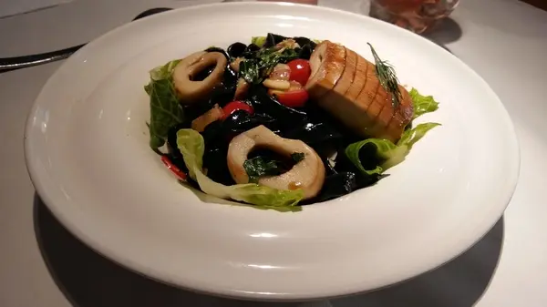 香Q彈牙的竹炭麵,一直被同桌格友笑稱像在吃蒟蒻,搭配水果醬汁烘烤外型做的像極了花枝的杏鮑菇,再以橄欖油及香蒜拌炒而成,是一道創意十足的風味料理。