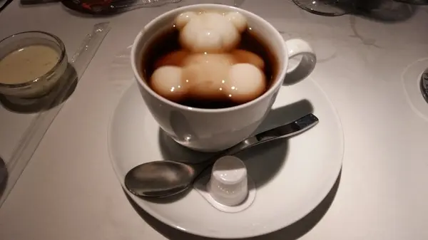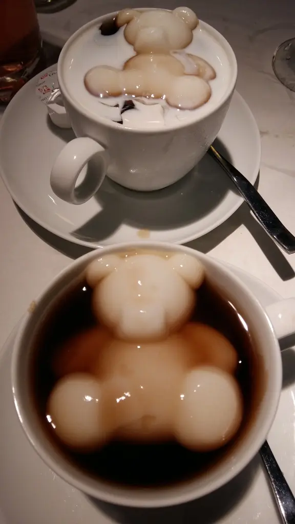 純白杏仁可愛小熊悠閒泡澡的療癒Q彈模樣,真讓人捨不得吞下肚,看得出充滿了甜點師傅們的細膩巧思。不明顯的杏仁味不會令人感到害怕,搭配濃郁黝黑的咖啡凍,甜而不膩,Q彈的口感卻有兩種截然不同的享受。