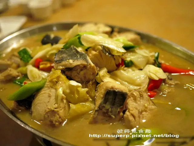 酸菜悶魚(使用了少見的高麗菜酸來煮魚。味道鹹中帶酸,但又不會嗆。調味很棒,可惜這天的魚塊稍微有點老,如果用魚頭效果應該會更好,因為魚頭旁邊的肉最嫩,不過還是推啦)