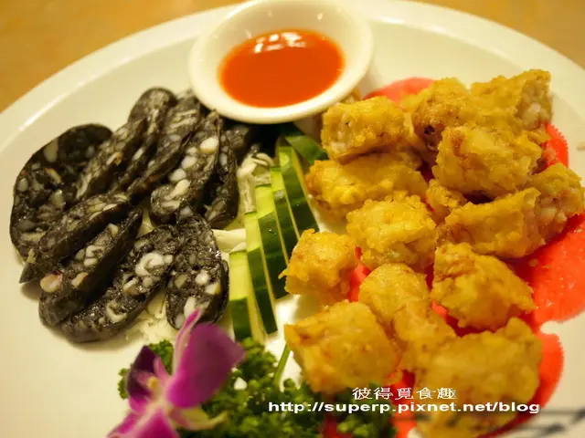 蝦捲墨魚腸雙拼(蝦捲還OK,不過墨魚腸的水準倒是令人驚喜!墨魚腸現在已經沒那麼少見了,但通常吃噱頭而已,以前吃過最好吃的墨魚腸在捷運雙連站旁的牛肉陳內。不過竟然發覺北海漁村的墨魚腸裡的墨魚塊口感處理的更為柔嫩,滋味更鮮,更勝牛肉陳,大推!)