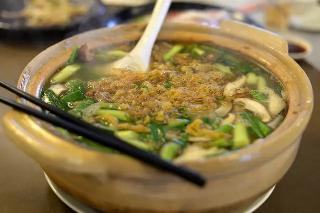 青蔥、香菇,蛋酥、油蔥……煨著香噴噴的湯頭和著米粉,呼拉哈拉的可以一碗接一碗的好過癮!