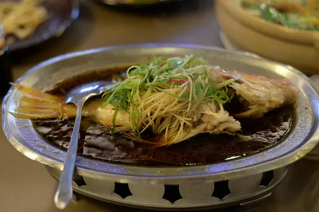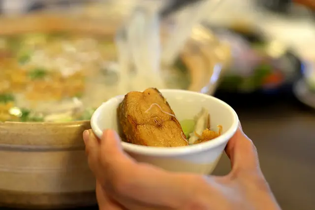 剁切大塊的鯧魚先炸過鎖住裡面的肉汁與鮮嫩再砂鍋煨煮;無損魚肉的鮮嫩,