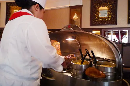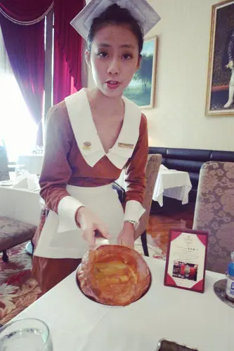 這是今日的女廚師。推上來專業的牛排料理餐臺。這是Lawry's的「銀色不鏽鋼牛肋排餐車」。可以根據顧客的需求選擇自己想要的份量及熟度,廚師在餐桌旁切下牛肉,另外也有配菜可以選用,有波菜泥、薯泥、奶油玉米、青豆,我們就各來一點試看看吧!