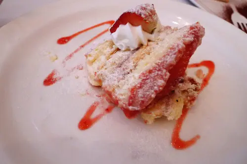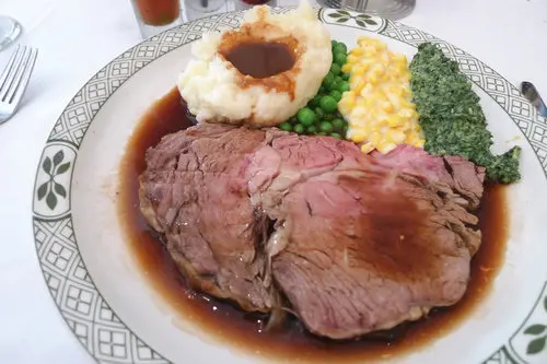 牛排大約是五分熟,可以吃原味或是沾上辣根醬,醬料我記得有三種可以選擇。Lawry's 提供的牛排是美國頂級Prime , 取自前肋脊部位。光用肉眼看就知道相當鮮嫩多汁,這也是評比屬最高等級的牛肉部位,一口咬下入口即化的絕佳口感令人回味再三。