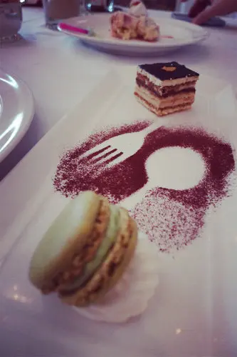 甜點是巧克力蛋糕及可愛的馬卡龍。