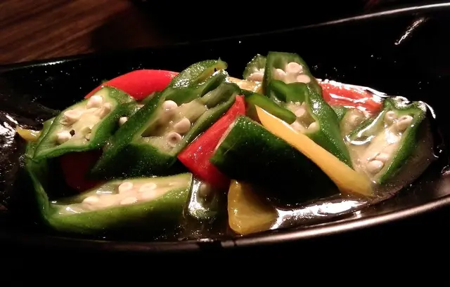 涼菜的「花椒油拌秋葵」處理的酸酸辣辣,算是少見的處理法