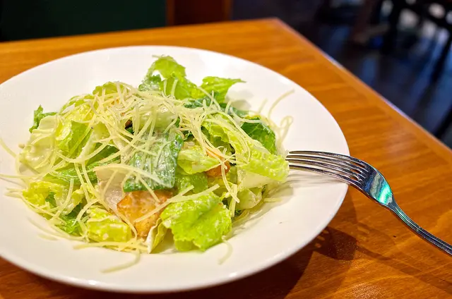 冰脆蘿蔓生菜,搭配鮮刨帕瑪森起司與手工起司麵包丁,拌入自製凱薩醬(節錄自官網)