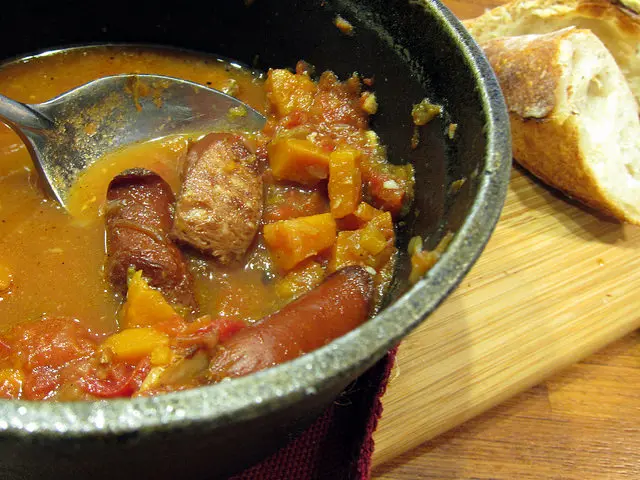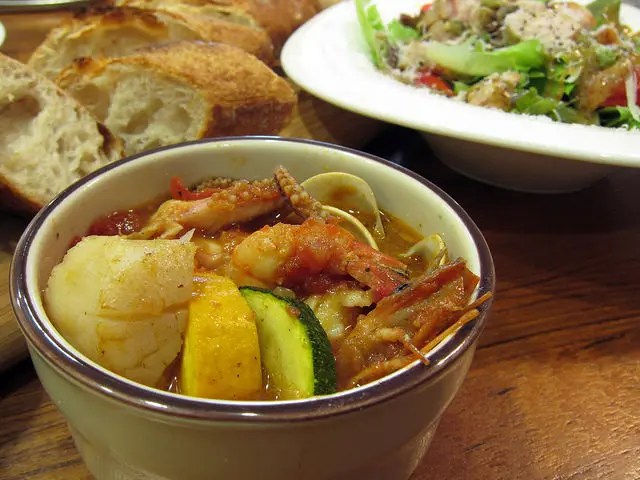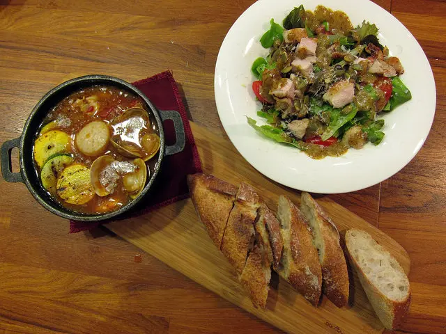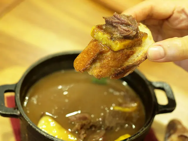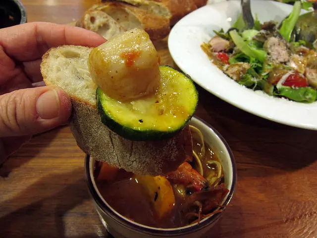 沾著牛骨燉煮湯頭的麵包上堆點牛肉;來片櫛瓜~