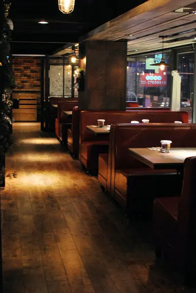 運用大量仿舊木板、造型燈具以及鋼架結合木質的桌椅營造倉庫般的現代摩登感。