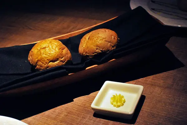 麵包為法式手工麵包,當天是核桃葡萄乾口味,外脆內軟,搭配奶油花鹹甜交織。