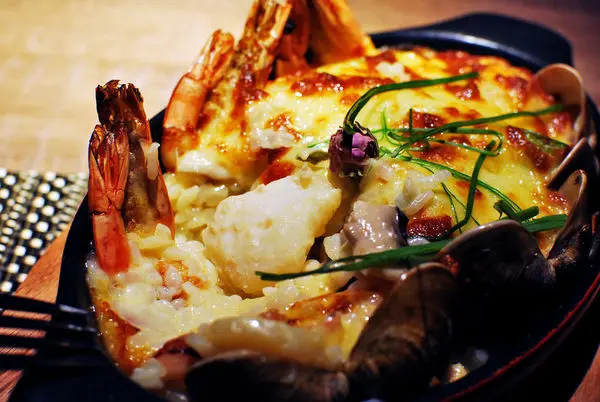 我點的是菜單上義大利麵/燉飯類寫著TOP1的青蒜白酒奶油海鮮焗烤飯$420。