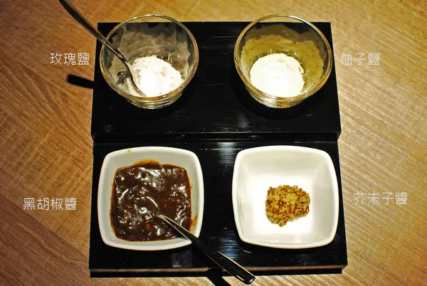 分別是玫瑰鹽、柚子鹽、傳統黑胡椒醬及、芥末子醬,一塊牛排多種滋味,不怕吃膩。