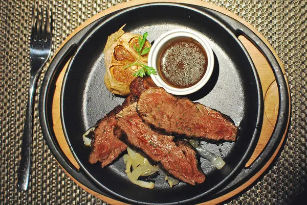 底層還鋪上洋蔥防止牛排過熟,沾醬附的是松露波特紅酒醬汁,還有一顆烤大蒜。