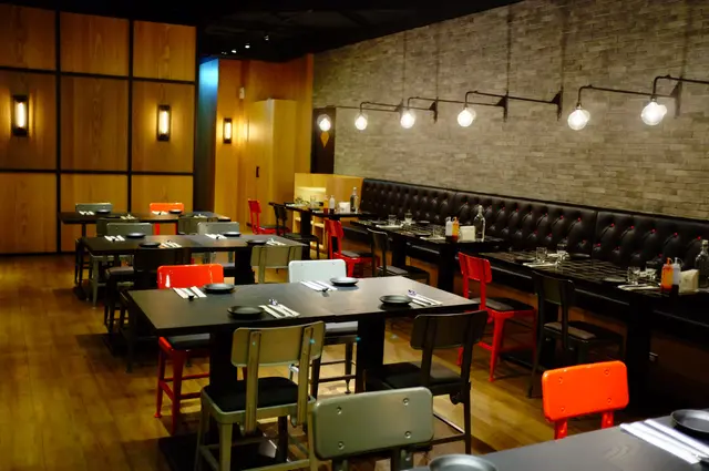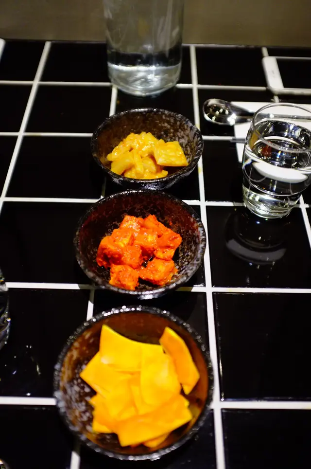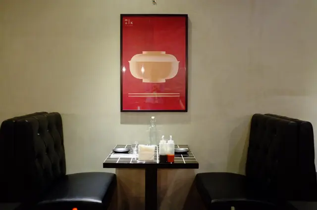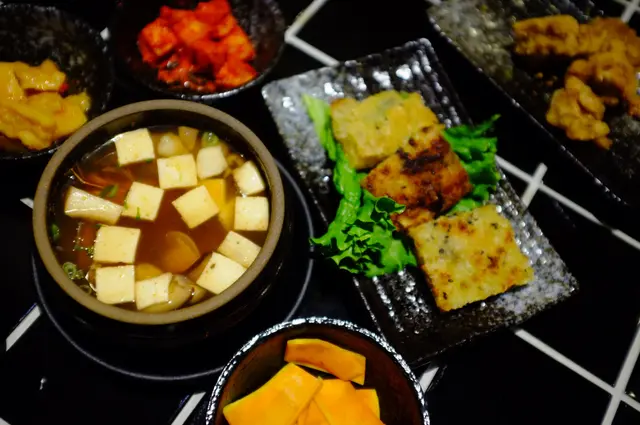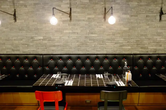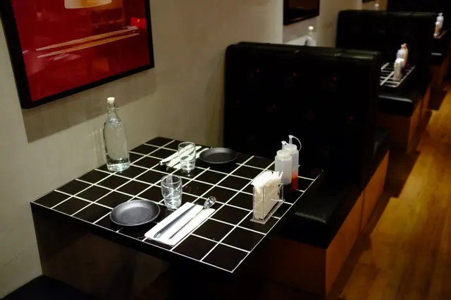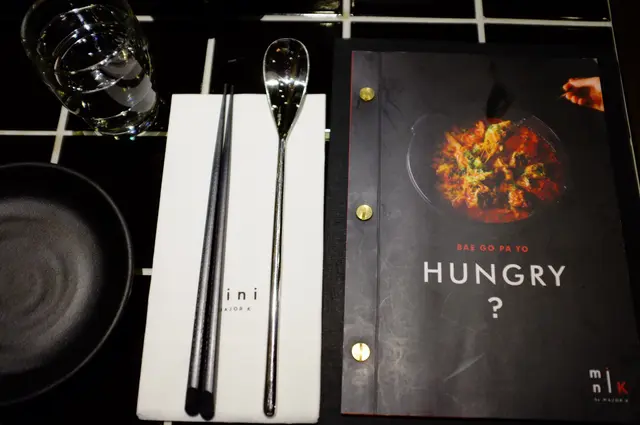 黑色磁磚面的桌子穿插白色線條很有時尚感,餐具選擇也不馬虎,而每個桌上都擺放了二瓶韓式醬料。
