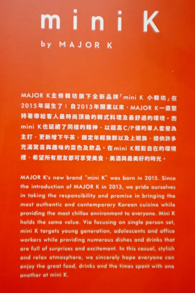 信義區為台北市的美食一級戰區,各式各樣的餐廳在這都能見到,若以韓式料理名氣較大的莫過於Honey Pig韓式烤肉,而mini K主打創意韓式料理。