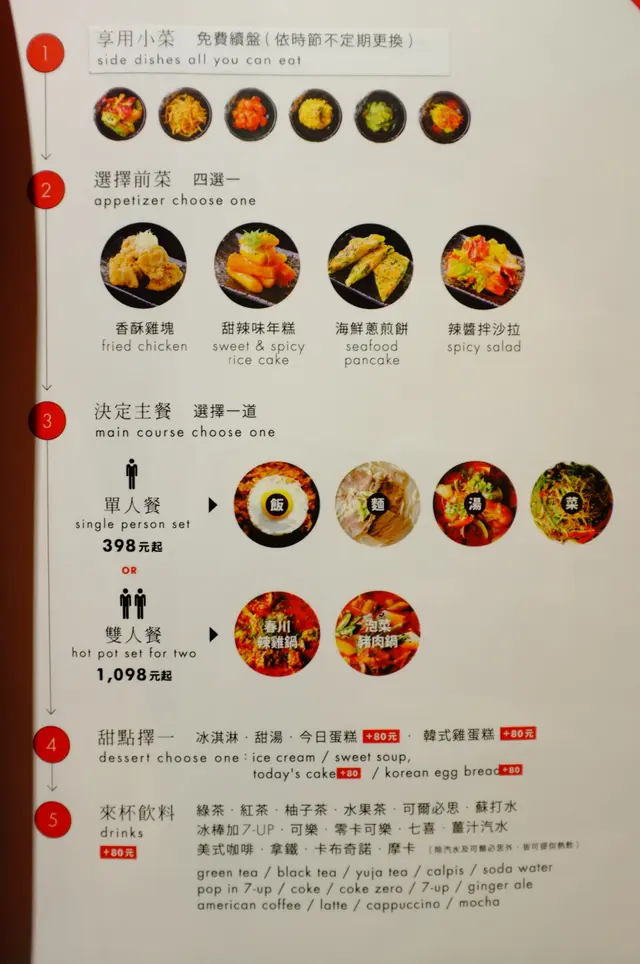 如何點餐呢?除了單點外,唯一需要解釋的是398套餐,小菜(免費續用)+前菜四擇一+主菜(視品項需加價)+甜點(冰淇淋 or 甜湯)。若想喝飲料的話大部份的輕飲料搭配套餐+80元。