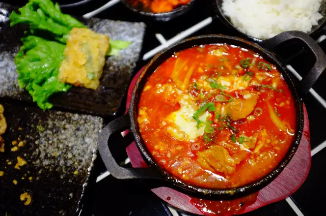 而春川辣雞的份量和味道則好多了,雞肉Q嫩,湯頭帶著少許的起司和大量的年糕片,搭配濃稠香辣的湯汁搭配飯還挺對味的,事後才想到如果點個辛拉麵應該能加不少分。