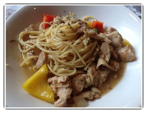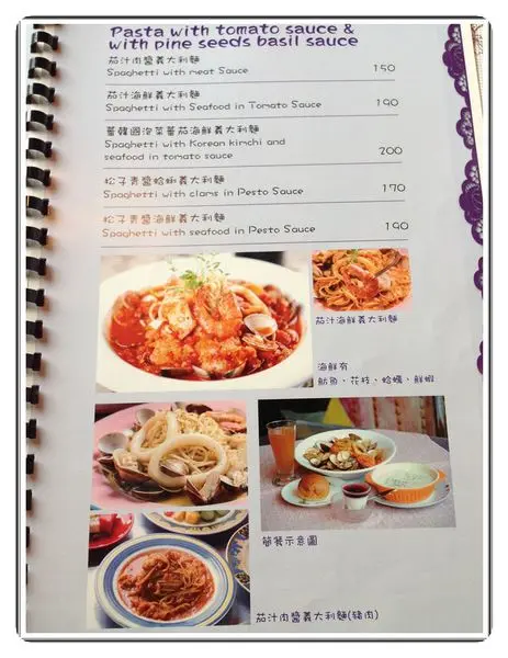 香蒜雞肉義大利麵$170:份量挺大的,但是乍看之下有點訝異,不管是看起來還是吃起來都很台式口味,有點像是雞肉羹麵,雖然是使用義大利麵條但吃起來有點像油麵軟軟的,湯汁有點過多且有用太白粉勾芡的感覺,整體味道還不錯就是很台式,完全沒有義大利麵的口感。