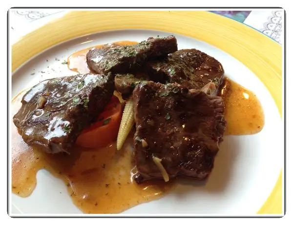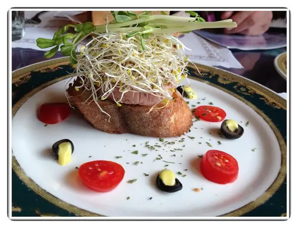 法式鵝肝:一片法國麵包放上鵝肝和苜蓿芽,擺盤挺漂亮的,沒有沾醬可以搭,法國麵包偏硬吃起來挺吃力的,鵝肝軟軟綿綿帶點腥味,整體來說我覺得普通~