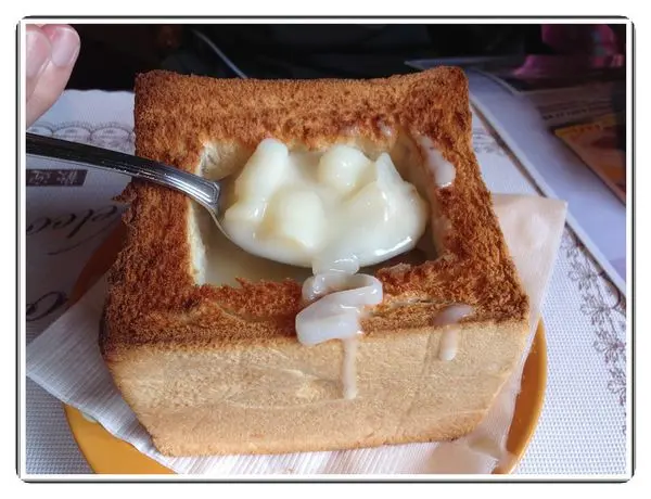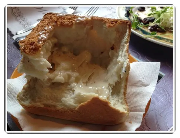 奶油玉米麵包湯:外皮烤得酥酥脆脆的吐司,裡面成裝著奶油玉米濃湯,濃湯份量不多約4湯匙左右大概是受限於吐司的大小吧!濃湯地味道挺好的,白吐司內裡吸滿了濃湯,軟軟綿綿又有奶香,非常好吃~