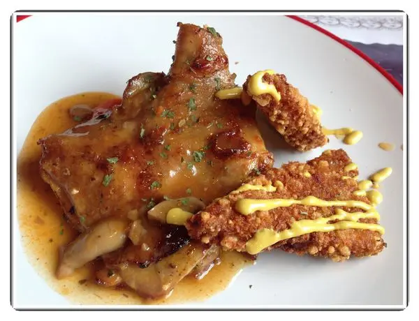 豪華海陸:魴魚排佐蜂蜜芥末醬+燻香烤雞排,魴魚排炸得酥酥的很香;雞排鮮嫩多汁也有入味,味道還不錯。