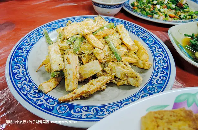 筊白筍加片, 加上四季豆, 和完整的鹹蛋一起捲炒,
