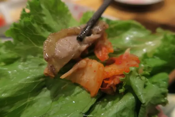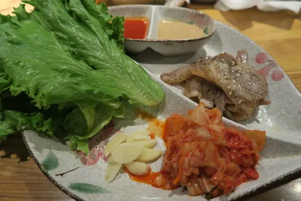 這個好大盤上面放了生菜、泡菜、蒜片、健豬肉