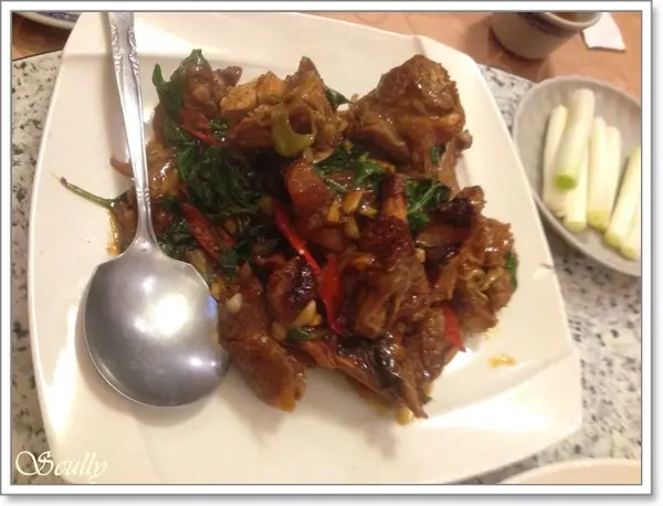 第二吃:醬爆鴨:鴨骨肉還滿多的,炒得油油亮亮很夠味,吃起來挺辣的,鴨肉也滿緊實有勁~