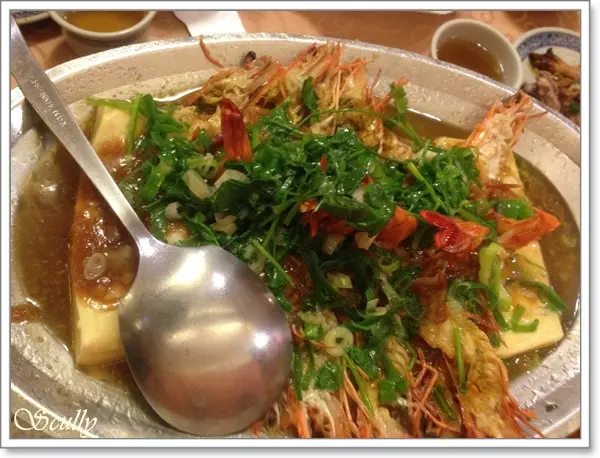 蒜泥蒸蝦:菜單沒看到這一道菜,所以不知道價格;8隻蝦上面佈滿蒜泥下面墊著雞蛋豆腐,蒜泥汁重口味甜甜香香,蒸過後香味四溢,滿滿的蒜香,雞蛋豆腐很嫩單吃就好吃,配上蒜泥更棒,蝦因為都貝蒜泥的味道給掩蓋過了,所以吃不出他的味道~