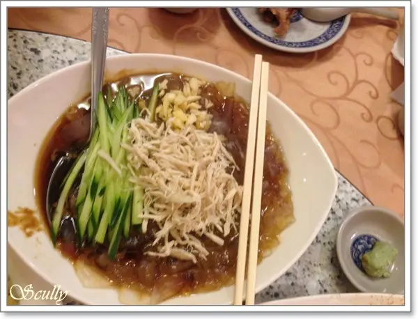 雞絲拉皮:菜單有這一道但是沒有價格,有雞胸肉、乾粉皮、小黃瓜,搭配酸酸甜甜的醬汁,攪拌均勻後麻醬香撲鼻而來,吃起來清爽又冰涼,最適合夏天食用了~