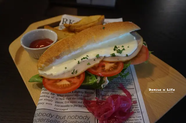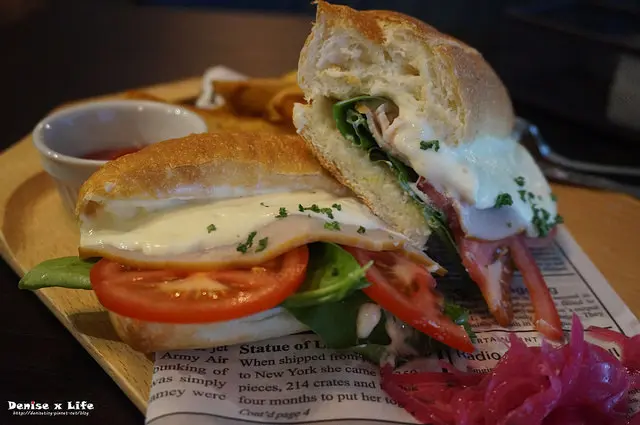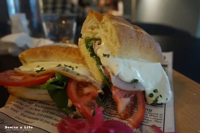 這份三明治的麵包是軟法,裡面有番茄、波菜、火雞肉及滿滿的起士
