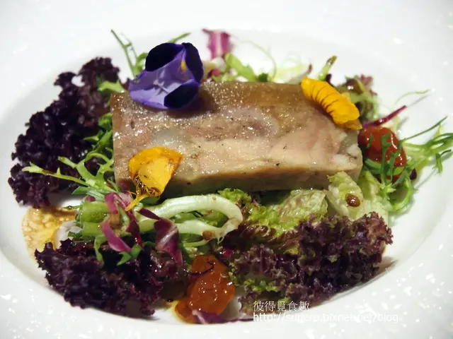 法式肉凍沙拉(肉凍據說是用在永樂市場買的黑毛豬做的,燉了兩天,把油脂都燉出來了,柔和鮮美。搭配生菜跟油漬番茄以及巴薩米克醋,清爽可口,大推!)
