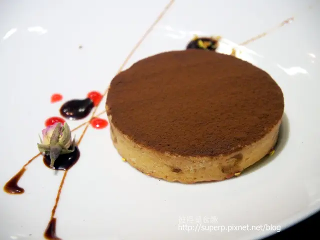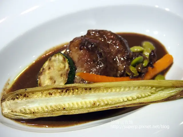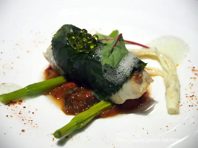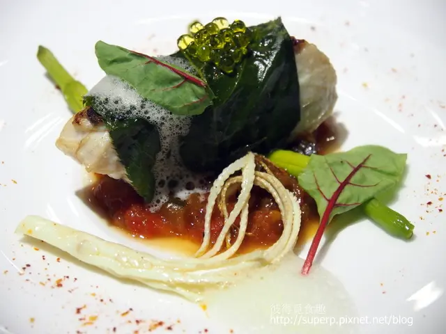 烤魚(魚是青衣,柔軟可口,用帶著微鹹的櫻花葉包著,上面是檸檬泡泡跟橄欖油做的魚子,下面是蘆筍跟法式燉菜,旁邊還有放檳榔花。也不錯,但覺得整體有點太複雜了。)