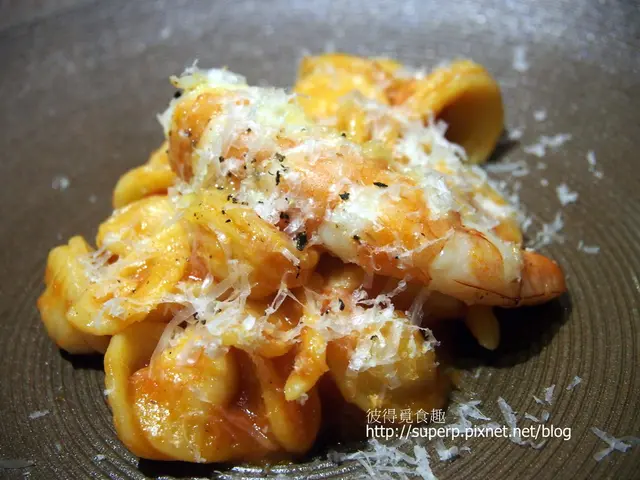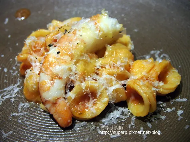 天使紅蝦貝殼麵(天使紅蝦體積不小,處理的極為柔軟,非常好吃。紅醬煮的還不錯,推!)