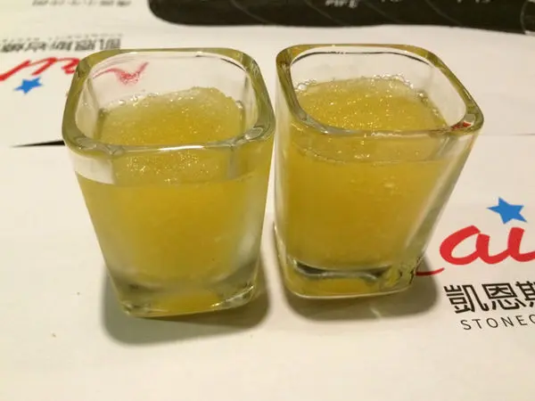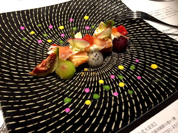 很難講清楚什麼是什麼,就味道而言最右邊的有種清淡的甜味,不僅食物入口有層次,連吃在嘴裡的觸覺都有層次,有果凍跟肉類的分別,中間則有微酸的味道,最右邊的豬肉則是鹹味,覺得是滿好吃的前菜,我最喜歡右邊兩個。