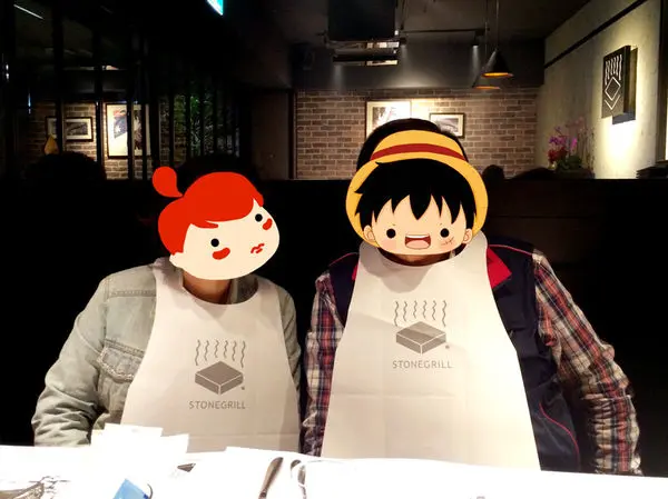 然後店員就會幫每個人為上圍兜兜囉 (其實我覺得還是要在石板上來之前圍好,不然位置很小,移動怕燙到危險!! 高雄店就是上石板前圍好的唷!!)