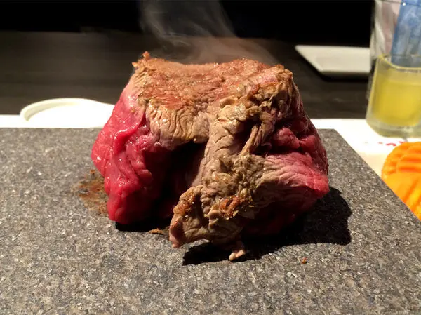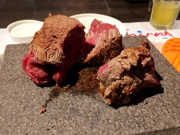 起初會一起上生肉,然後同桌會有好幾個服務生一起協助初步烤肉,大部分幫忙烤到3分熟,烤得過程大概也會詳述此種肉質要烤到什麼程度最好吃,之後店員會把肉墊在胡蘿蔔上方隔熱,避免烤得過老,剩下就由顧客自行操作。