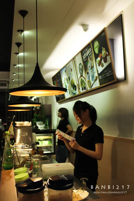 斑比我和老公某天挑在周日的晚上9點左右前來,還好有位置!門口擺的綠色抹茶冰淇淋燈上掛著牌子寫著"宇治抹茶使用"。